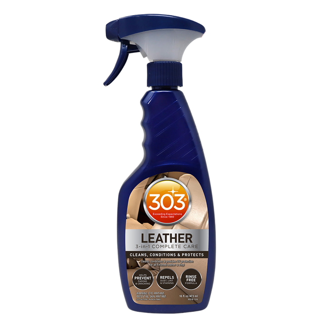 303 Automotive Leather 3-in-1 Complete Care cleans, conditions and provides UV protection to all finished leather and vinyl. It will help clean up surface dirt and grime, as well as helps repel future dust, lint and stains.