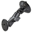 The RAM-B-166-202U consists of a double socket arm, 3.25" suction cup twist lock base and round base adapter that contains the universal AMPs hole pattern. The mount is designed with a RAM 1" diameter patented rubber ball and socket system that has adjustment points at both ends of the double socket arm; this allowing for almost infinite adjustment and perfect viewing angles. The hole pattern found on the round base adapter will connect to many RAM cradles. The suction cup base is designed to have a strong hold on glass and non-porous plastic surfaces, including RAM adhesive disks.
